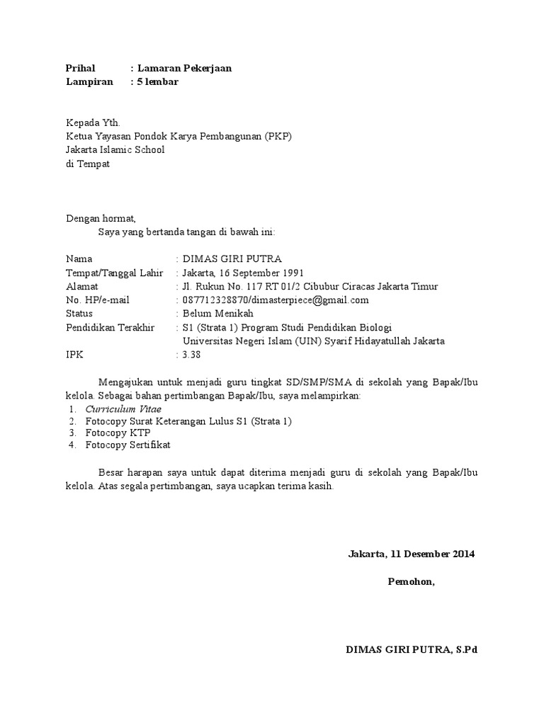 Contoh Surat Lamaran Kerja Guru Yang Baik Dan Benar Lengkap