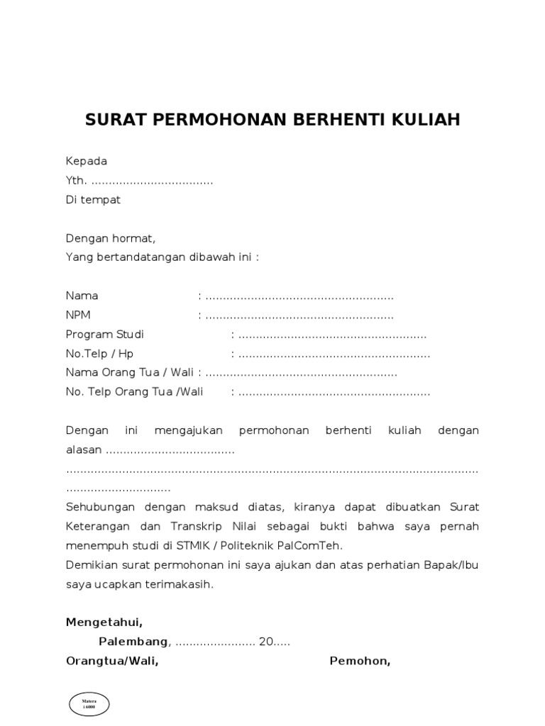 Surat Permohonan Berhenti Kuliah
