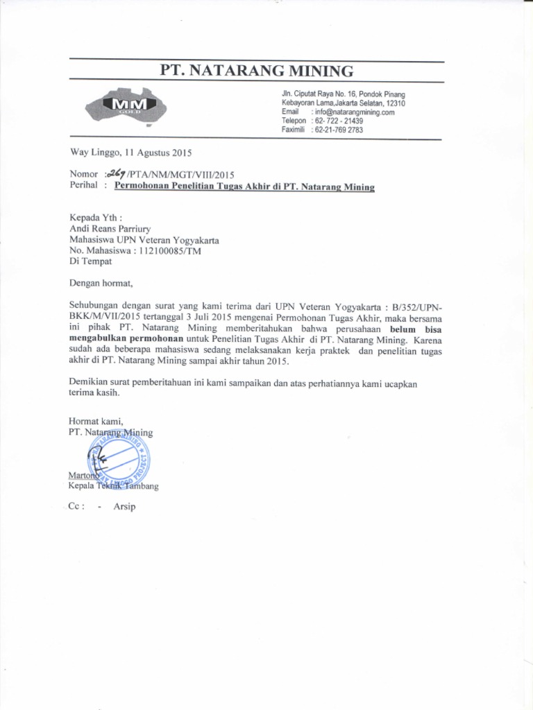 Surat Balasan Penolakan Pkl 2015 Mahasiswa Upn
