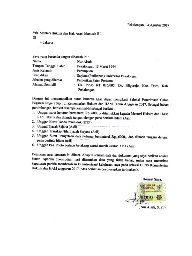 Contoh Surat Lamaran Dan Pernyataan Cpns Kemenkumham 2018