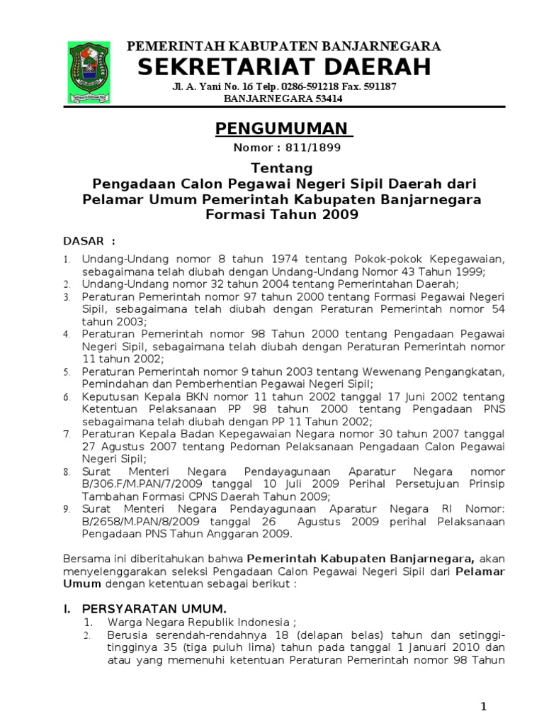 Pengumuman Penerimaan Cpns Kabupaten Banjarnegara Tahun 2009