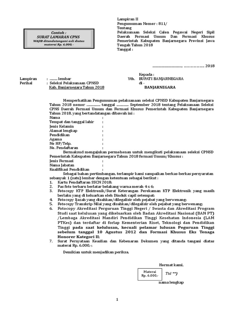 Contoh Surat Lamaran Cpns Banjarnegara