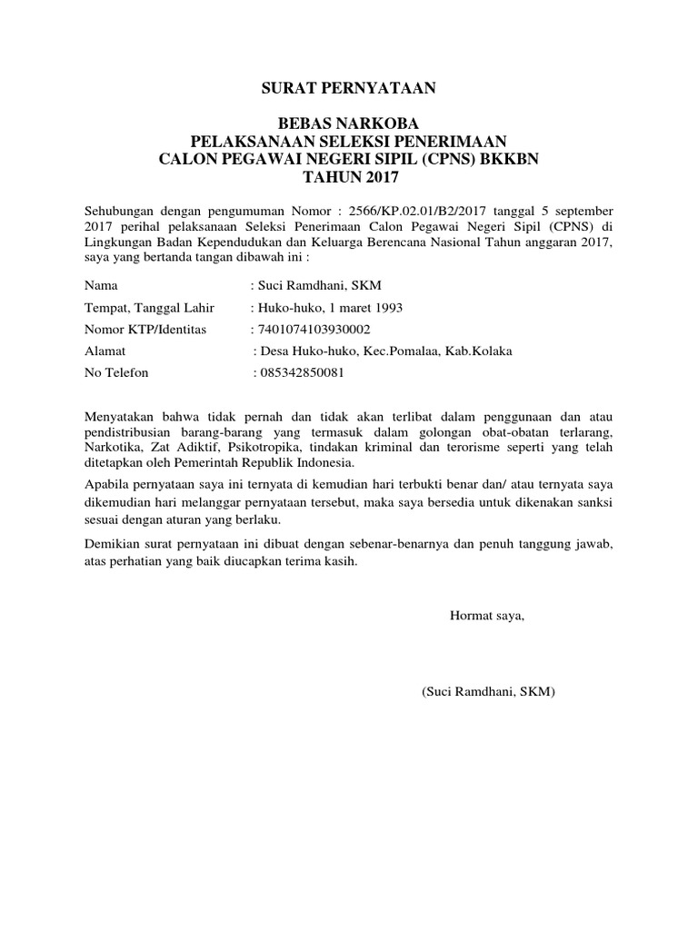 Contoh Surat Bebas Narkoba Cpns Bkkbn