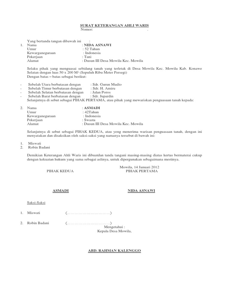 Contoh Surat Ahli Waris Tanah Dari Desa